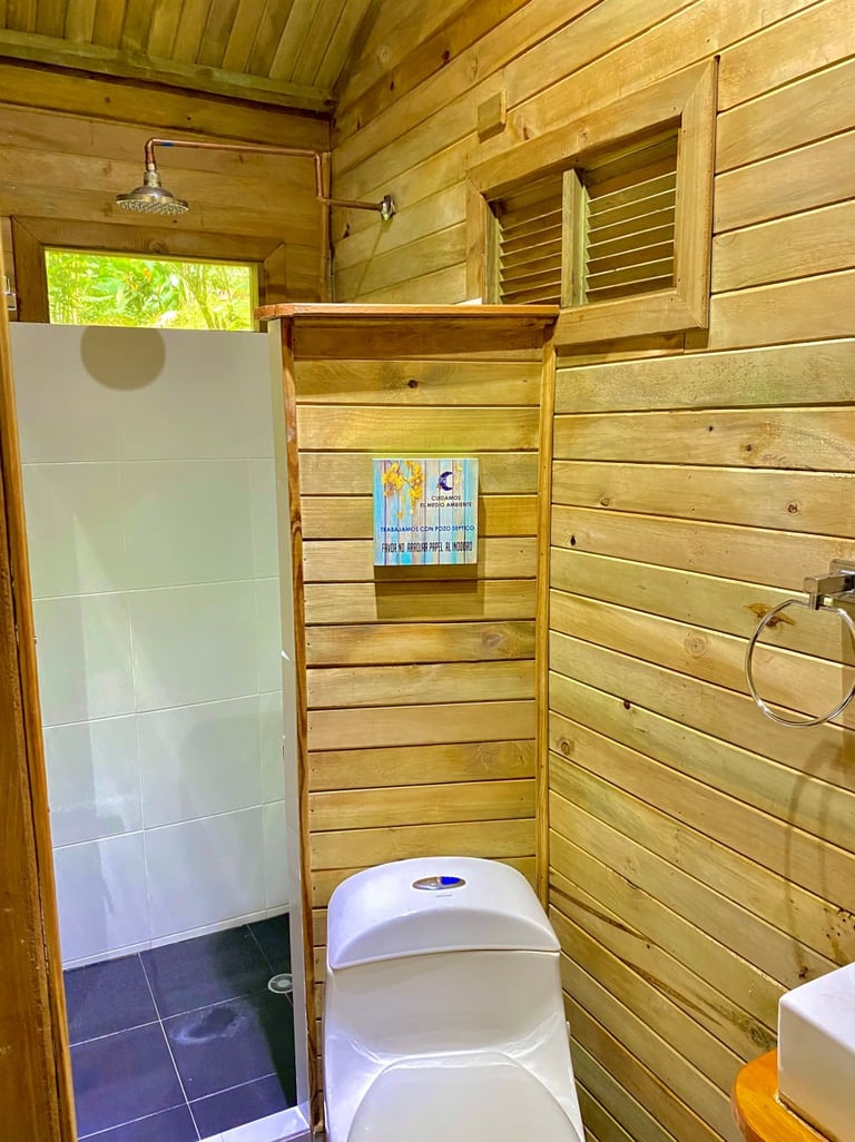 El baño de la cabaña La Lunaja es un espacio con un estilo único, cómodo y bien equipado. Ideal para que tomes una relajante ducha.